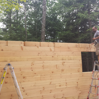 We transported an entire pallet of loft joists up to the cabin. We loaded the pallet on a car trailer down at the car lot and drove it up. Once we got to the clearing at the end of the Class VI road, we off loaded them on to my homemade trailer and hauled them to the cabin site. It was about an 8 minute ride to get to the top from the clearing. At the top, we unloaded and stacked all of the joists. Then we headed back down for another load. It took 5 trips total. After finishing the trailer load, we had to get 66 2x4s out of the bed of my truck and bring them up. We stacked them on the roof rack of the quad (24 at a time) and drove them up to the top. We finished in 3 trips. Once all of the transportation was finished, we got to work. We had realized the night before, that we were supposed to cut notches for the loft joists, in Row "N" before we put it up and we hadn't done that. We took down Row "N" and cut all of the notches and put it back up. This took quite some time, so after finishing the notches, Christy and I cut and placed one loft joist to see how it would fit. Then we called it a day.